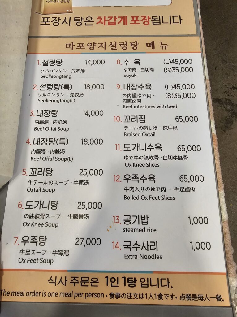 私がいつもいただくのは、お店の看板メニュー、ソルロンタン(14,000W 2026.4現在)です。